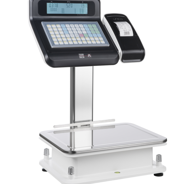 Il grande display a colori, doppio e orientabile, fornisce una visualizzazione perfetta, sia lato operatore che cliente, delle informazioni scontrino, delle immagini e presentazioni pubblicitarie, degli slogan promozionali creati ad hoc dal punto vendita. Come sempre, sono posizionate sulla colonna sia la tastiera a membrana con tasti termo-formati per una grande sensibilità al tocco, sia la veloce stampante ad alta risoluzione per la stampa di scontrini, carta adesiva ed etichette.